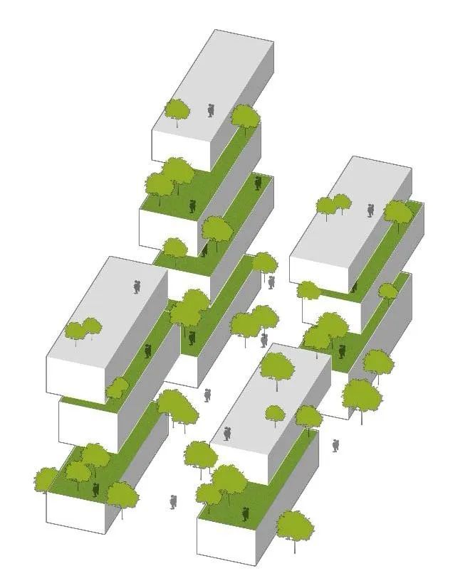 层层叠叠的露台以及超大空中花园、退台花园,将公园绿地在建筑体上不断延伸向上,形成“立体回游的森林”。
