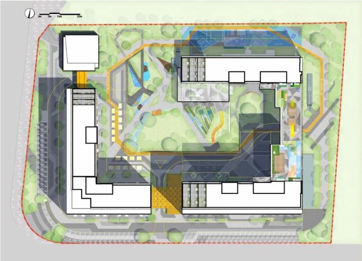 从总体上来看,榕心未来的三个体块建筑舍弃实体围墙相互围合,像三个没有消融的“俄罗斯方块”,互为相邻守望。