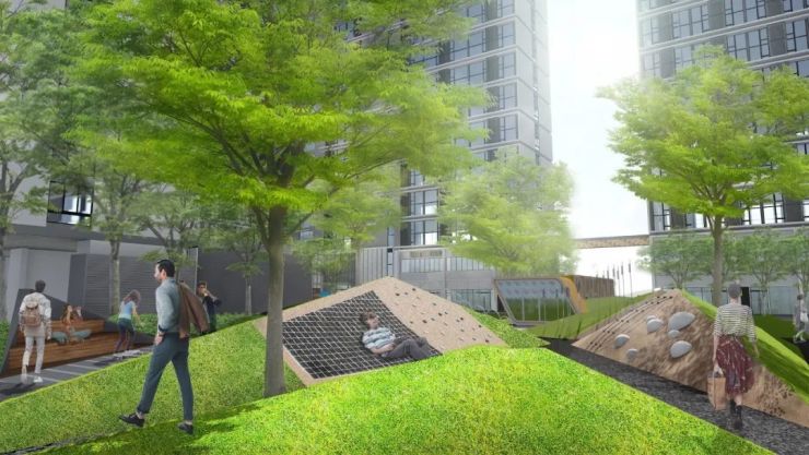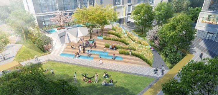 在这个没有围墙的开放式社区,内部建筑空间与外部城市空间时候是自然而然融合为一体的。五大景观场所作为公共空间与城市互动,复合而有序化的交通环境,营造舒适创新型办公和人居体验。