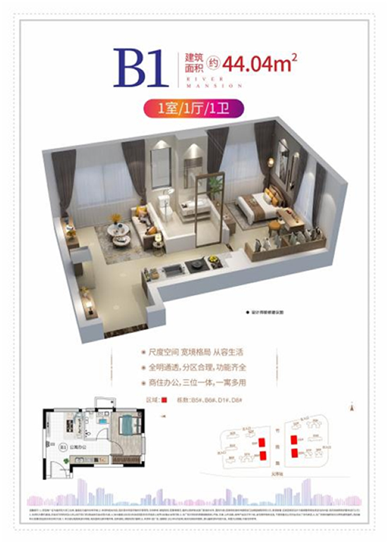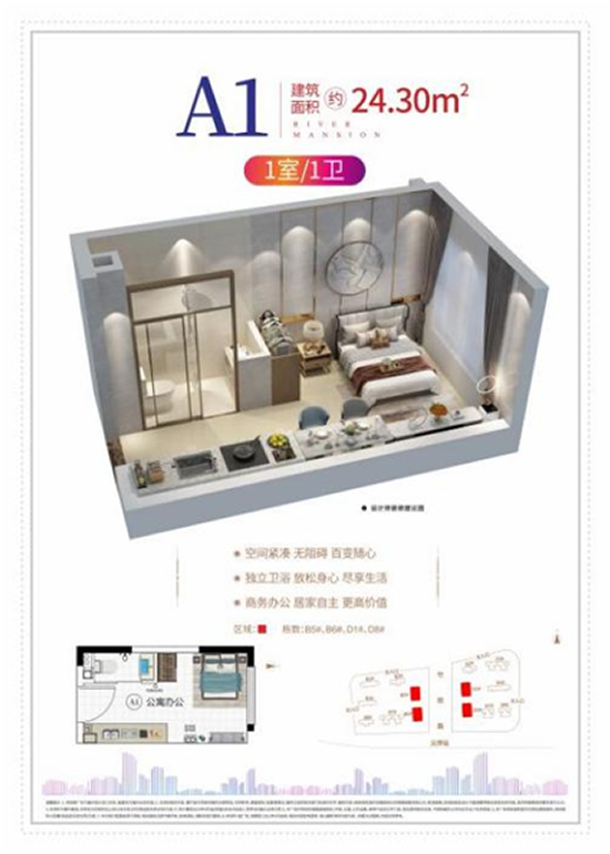 YOHO,本次主推两大户型产品。建面约24㎡1室1卫户型,入手门槛低,空间实用,百变随心,小投入实现高回报。建面约43㎡1室1厅1卫,格局宽舒,空间尺度大,全明通透商、住、办公三位一体,功能齐全,一室多用。