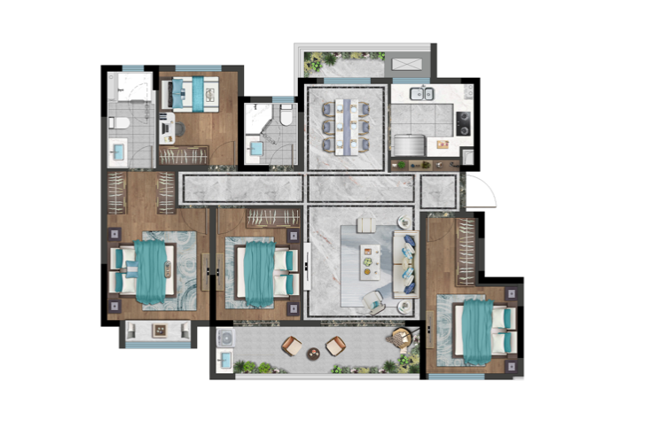 龙湖迪鑫·九里晴川室内建筑有三大王牌户型,以125㎡为例,四开间朝南,极致采光,南北通透,室内全明,餐、客、厨一体,通透敞亮,奢华气派,构建构建归家“仪式感”。大横厅规划设计更加灵活自由,完全可以将空间最大化。双阳台设计,纵享清风暖阳,动静分区,以精致匠筑阔绰。